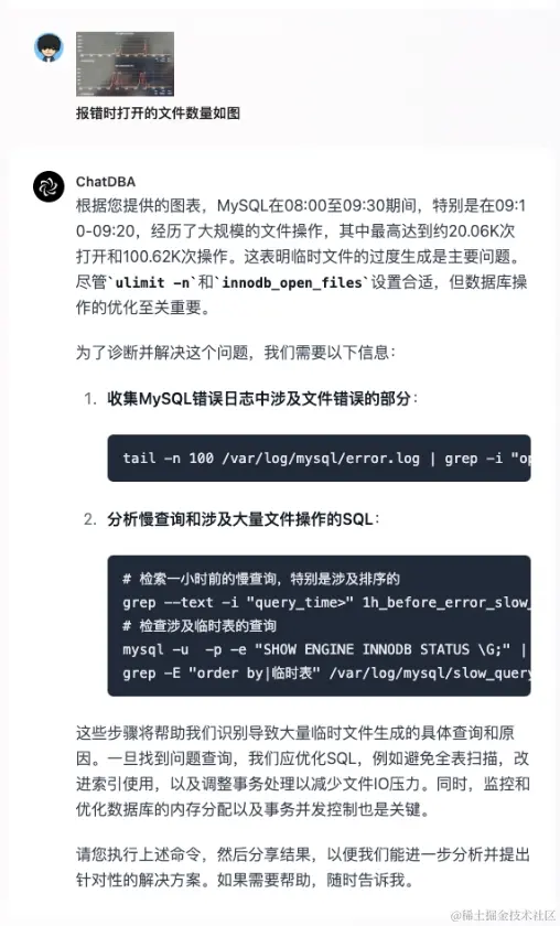 这时,ChatDBA 发现这些配置基本上满足需求,所以要求输入文件打开的数量、临时表情况等,所以接下来就将当时系统的监控图片上传到 ChatDBA。