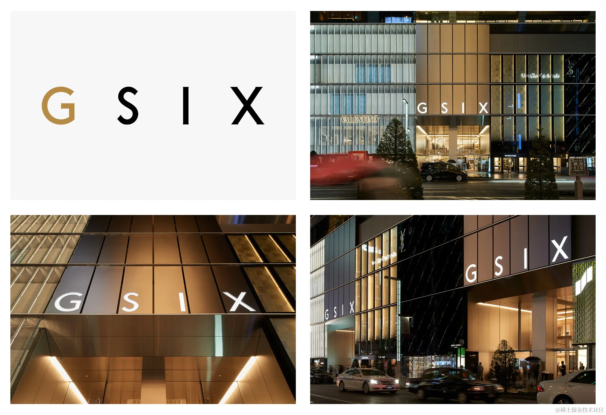 "GINZA SIX",是一处汇聚了国内外241家品牌的商业设施。LOGO设计体现了"轴性"理念,与奢侈品牌、现代艺术、传统及高科技等价值的融合相辅相成,四个字母的造型简洁有力,刻在建筑中心。