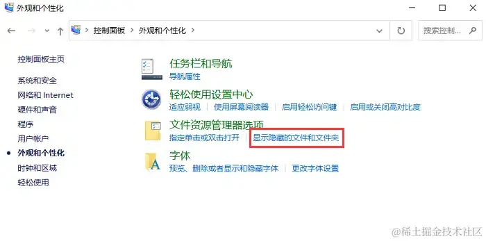 第3步:在**【文件资源管理器选项】下点击【显示隐藏的文件和文件夹】**选项。
