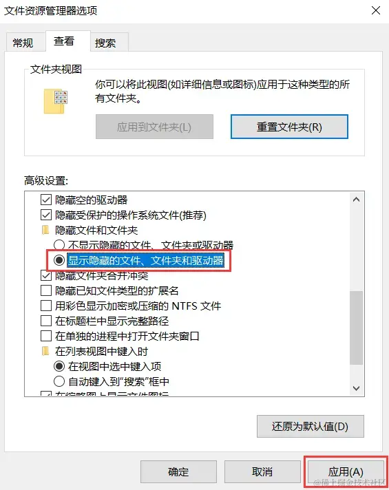 第4步:切换到**【查看】选项卡,勾选【显示隐藏的文件、文件夹和驱动器】,点击【应用】**即可。