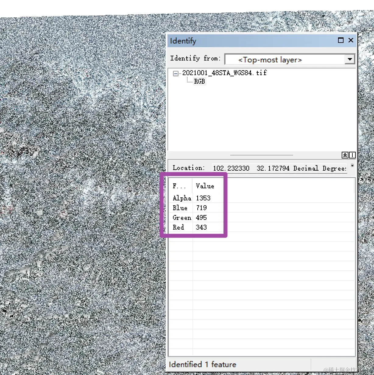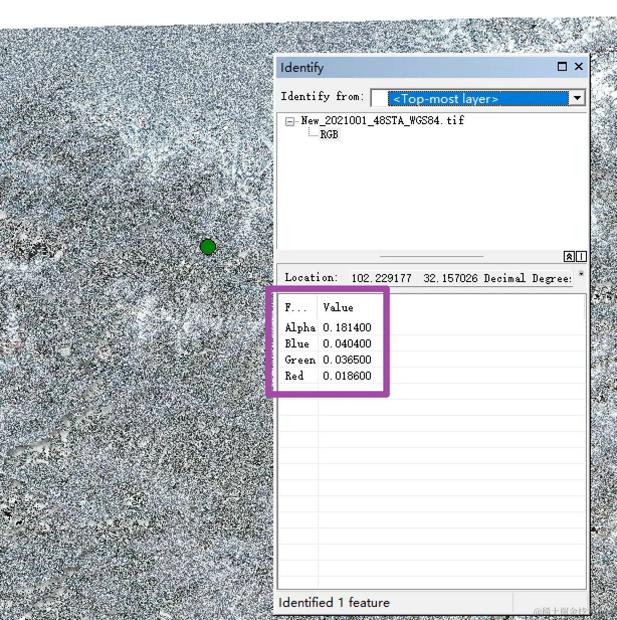 此时,打开本文开头展示的那1景遥感影像,可以看到其像素数值已经是乘上缩放系数之后的了,也就是落在了0至1的区间内;如下图所示。