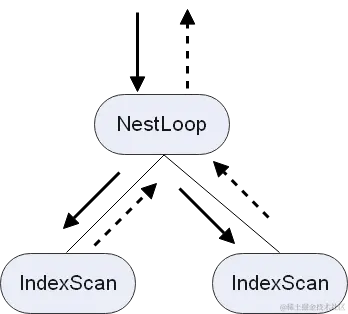 标准的迭代器模型如图1所示。控制流向下(下图实线)、数据流向上(下图虚线)、上层驱动下层(上层节点调用下层节点要数据)、一次一元组(下层节点每次只返回一条元组给上层节点)。