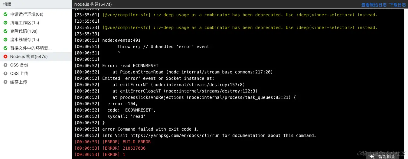 当在云效流水线构建后,会出现两类问题,一是直接报错,如下