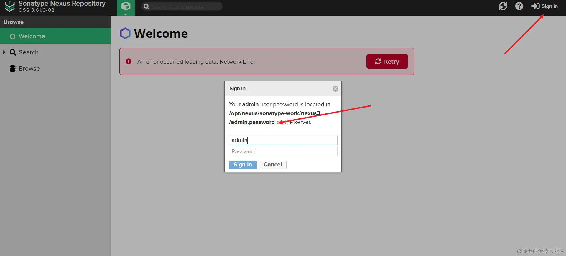 好,我们继续说 Nexus。Nexus 首页如下,第一次需要登录,然后修改初始密码。