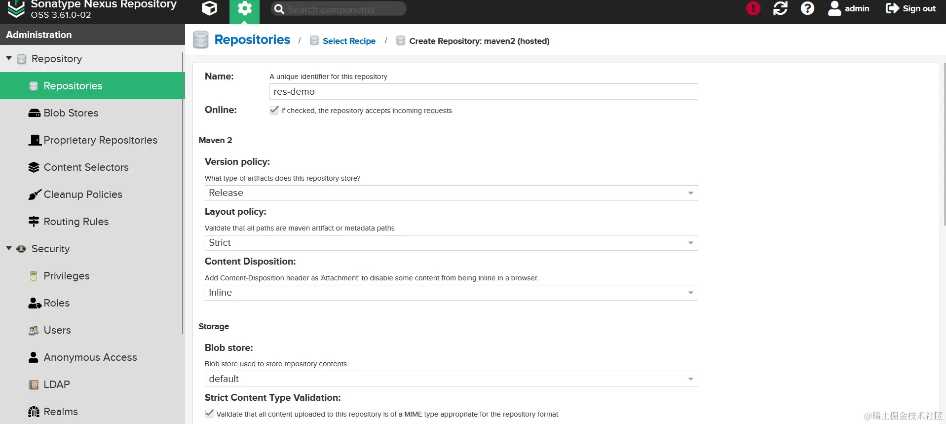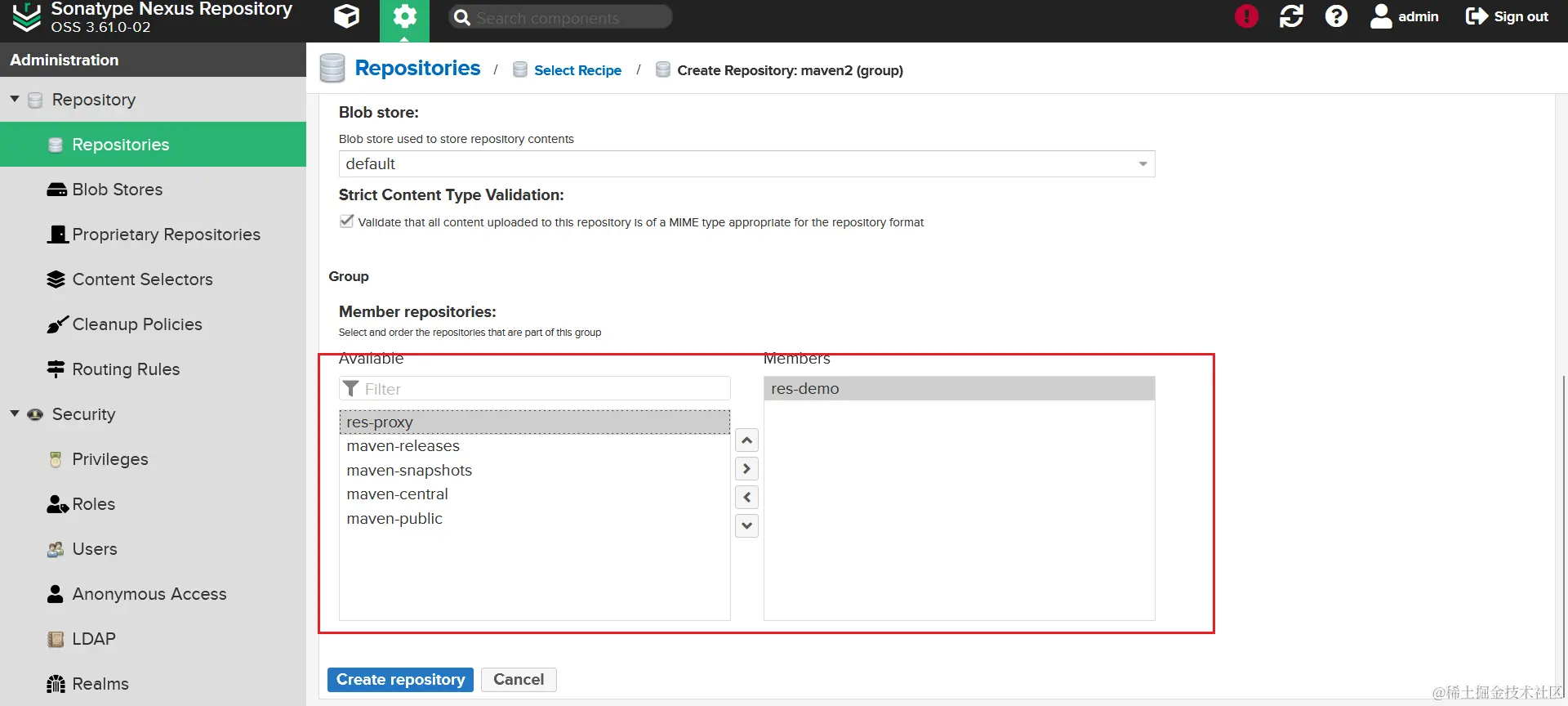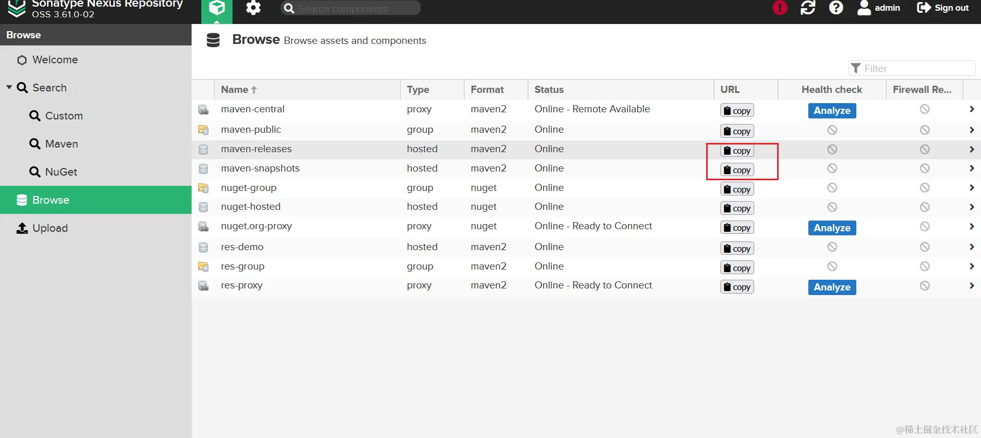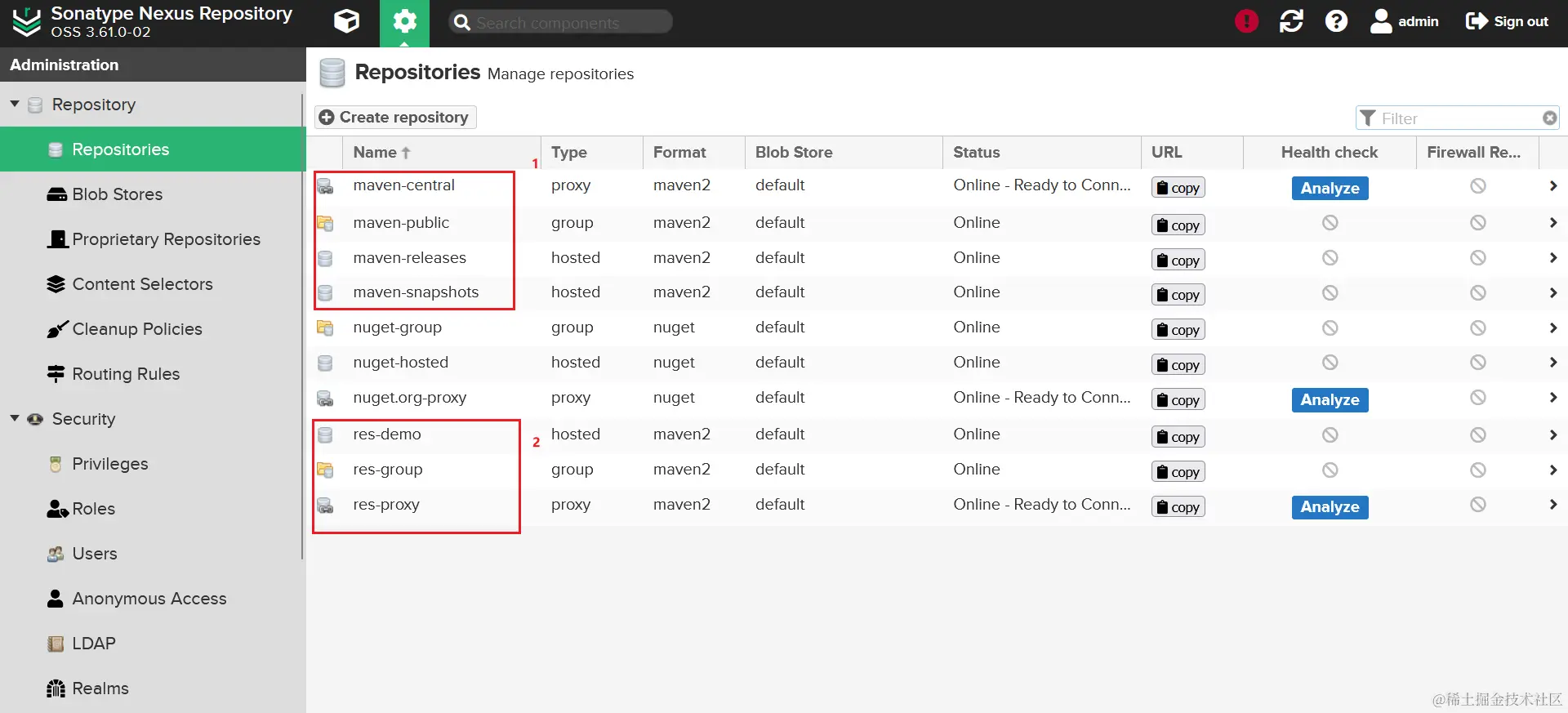 因为发布 jar 包涉及到 snapshots 和 releases 仓库,所以需要配置这两个的仓库的访问权限,同样的这是针对禁用了匿名访问的操作的,如果没有禁用匿名访问,这里依然不用配置。