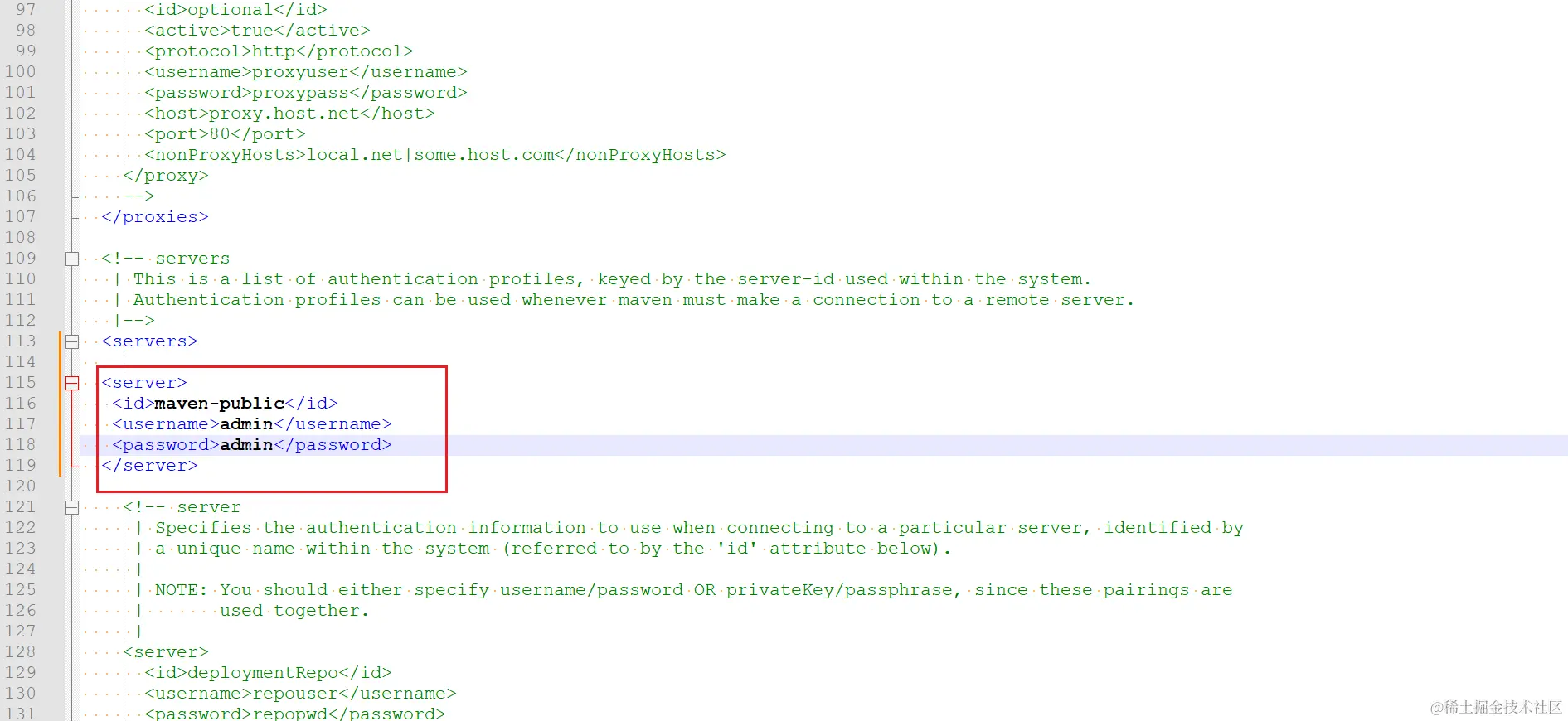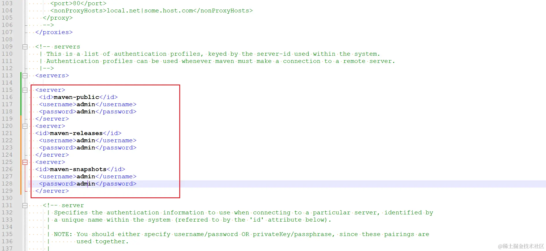 注意:server 标签内的 id 标签值必须和 mirror 标签中的 id 值一样,用户名和密码是修改之后的。