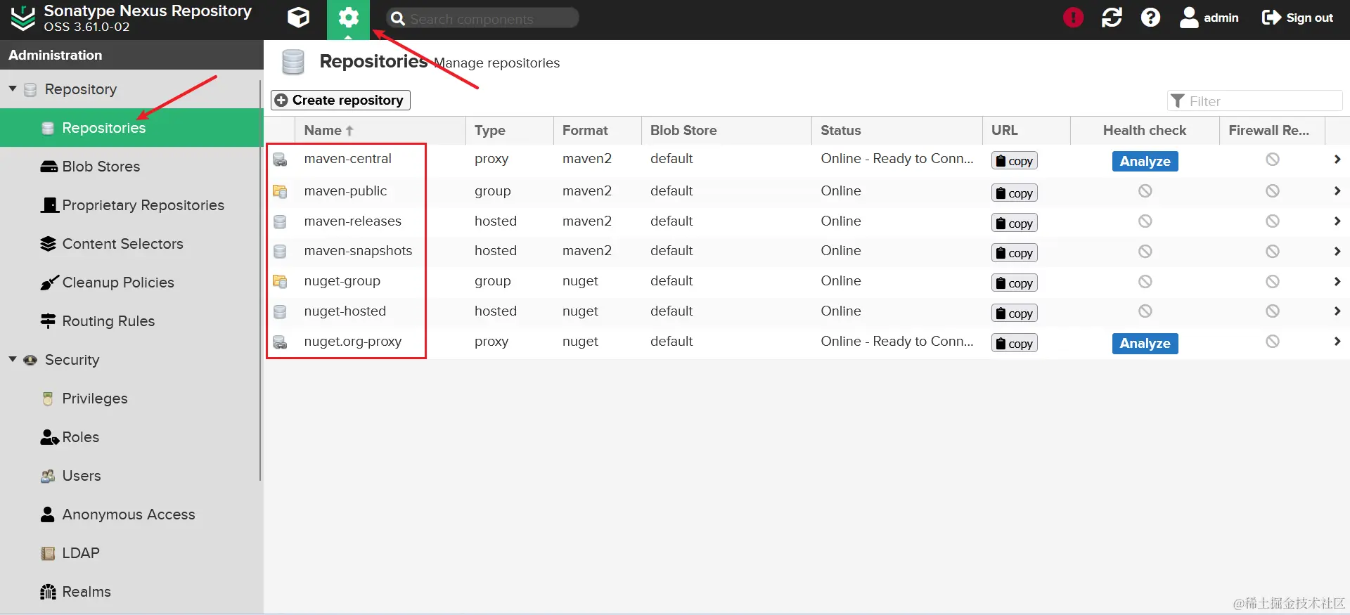 完成这些设置之后就可以看到 Nexus 的仓库了。Nexus 默认创建了几个仓库,如下: