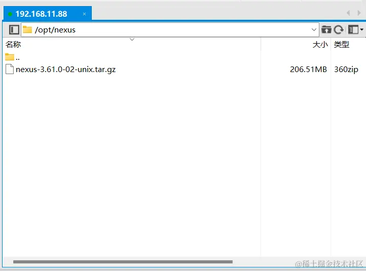 然后将下载的文件上传到 Linux 系统(我用的系统版本是 CentOS7),解压后即可使用,不需要安装(这里我放在 / opt/nexus 目录下)。