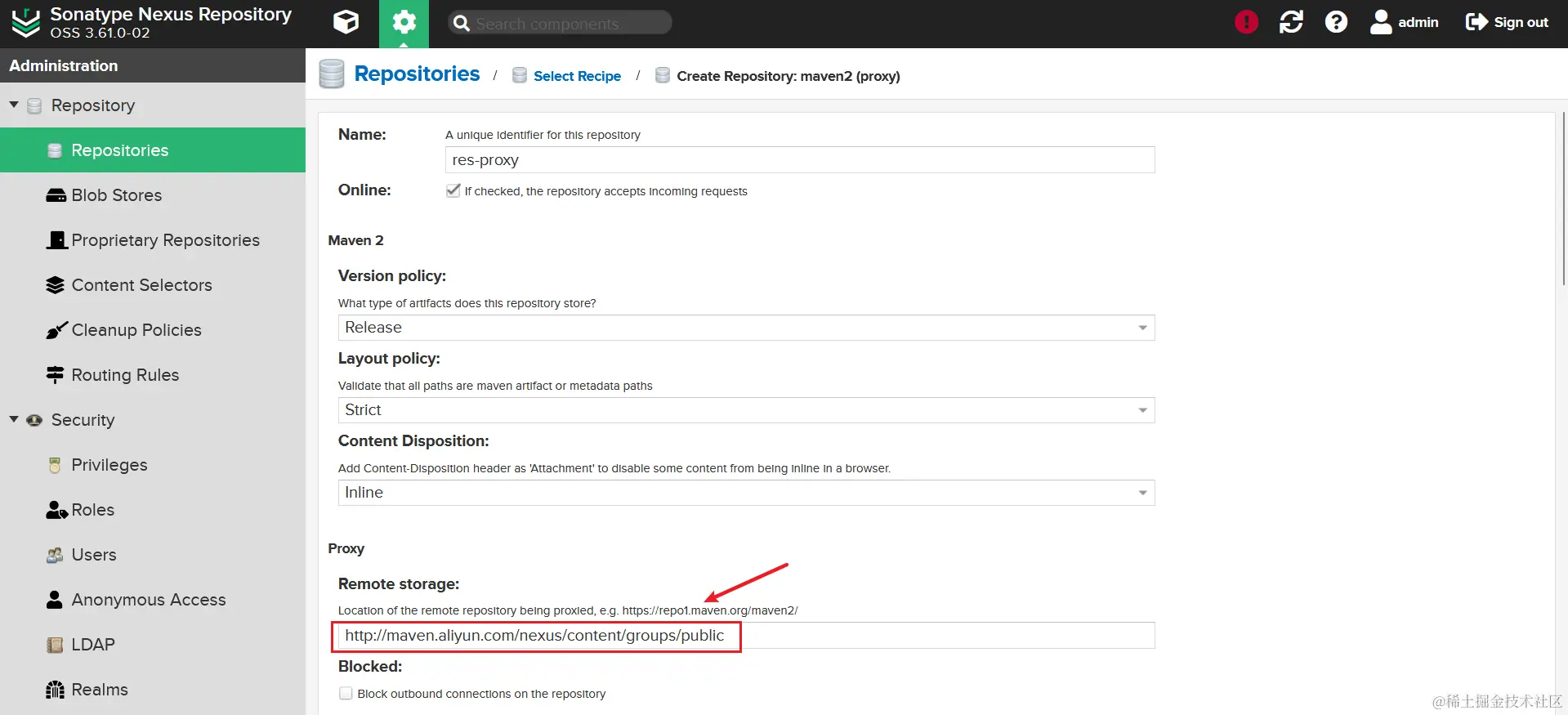 输入仓库名以及被代理仓库的 URL,这里我输入阿里云的仓库地址,默认为中央仓库。