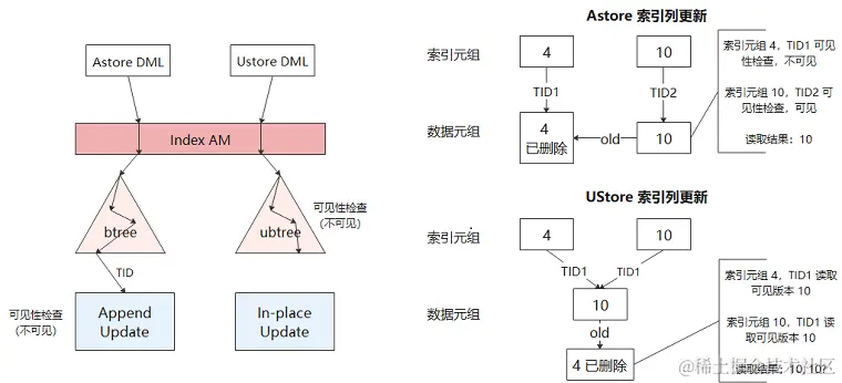 通过在索引页面元组上维护版本信息,UBtree能够在索引层进行 MVCC 可见性检查。同时 UBtree 也能通过版本信息独立判断索引元组是否已经无效(Dead),进而使得 in-place update引擎能实现数据表以及索引表上页级的空间清理,并在此基础上构建不依赖 AutoVacuum 的独立垃圾回收机制。