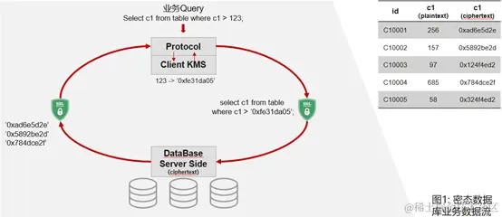 密态数据库数据流图 艾克SEO 2024-06-18 42 阅读1分钟 密态数据库数据流图 图 7 密态数据库数据流图 从该数据流图中可以看出,密态数据库允许客户端对客户端应用程序内的敏感数据进行加密。在查询期间,整个业务数据流在数据处理过程中都是以密文形态存在。优势如下: 保护数据在云上全生命周期的隐私安全; 通过将密钥掌握在用户自己手上,实现公有云、消费者云以及开发用户的用户信任问题; 让云数据库借助全密态能力更好的遵守个人隐私保护方面的法律法规。 使用场景 混合云场景:数据库客户端和数据库服务端均部署于用户私有网络,客户端采用华为管控界面。 公有云场景:数据库客户端在用户本地,数据库服务端在华为云。 公有云服务:数据库客户端和数据库服务端均在华为云。