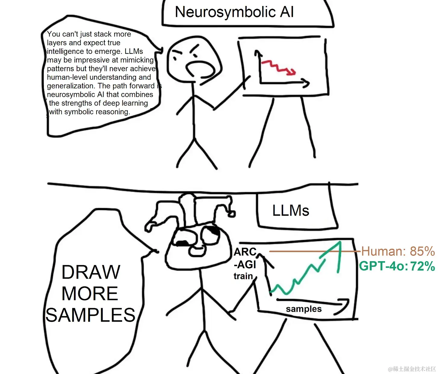 作者描述了他们在 ARC-AGI 数据集上实现 50% 准确率的方法,ARC-AGI 数据集是评估 AI 系统一般推理能力的基准。关键部分是使用 GPT-4o 生成数千个 Python 程序实现,然后根据它们在示例上的表现选择最佳的程序实现。作者使用了各种技术来提高性能,包括专门的提示、特征工程和修订步骤。作者的方法在这个数据集上的表现明显优于之前的最新技术。作者还讨论了这些结果对于大型语言模型局限性的说法的影响。