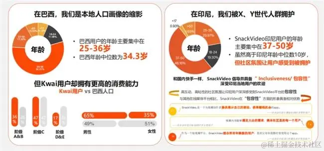 从用户规模来看,巴西月活用户高达6000多万,占巴西人口的30%,也就是说,三个巴西人中就有一个使用Kwai。印尼的月活用户也达到4000多万,且用户体量仍在持续上涨。