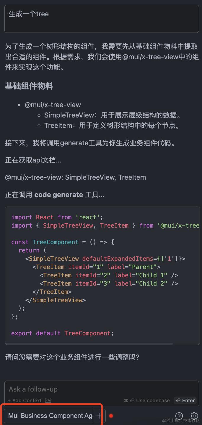 于是,我们开发一个 Agent 能够召回最新的 @mui/x-tree-view 组件知识来生成代码。