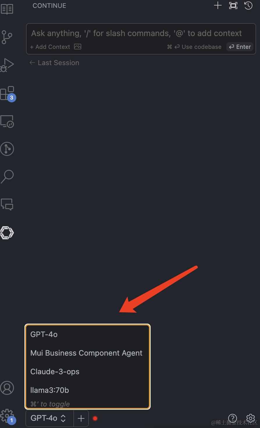 在 Continue 中,我们可以在每次使用时选择 Model Provider,来调度不同的 LLM Model。(如下)