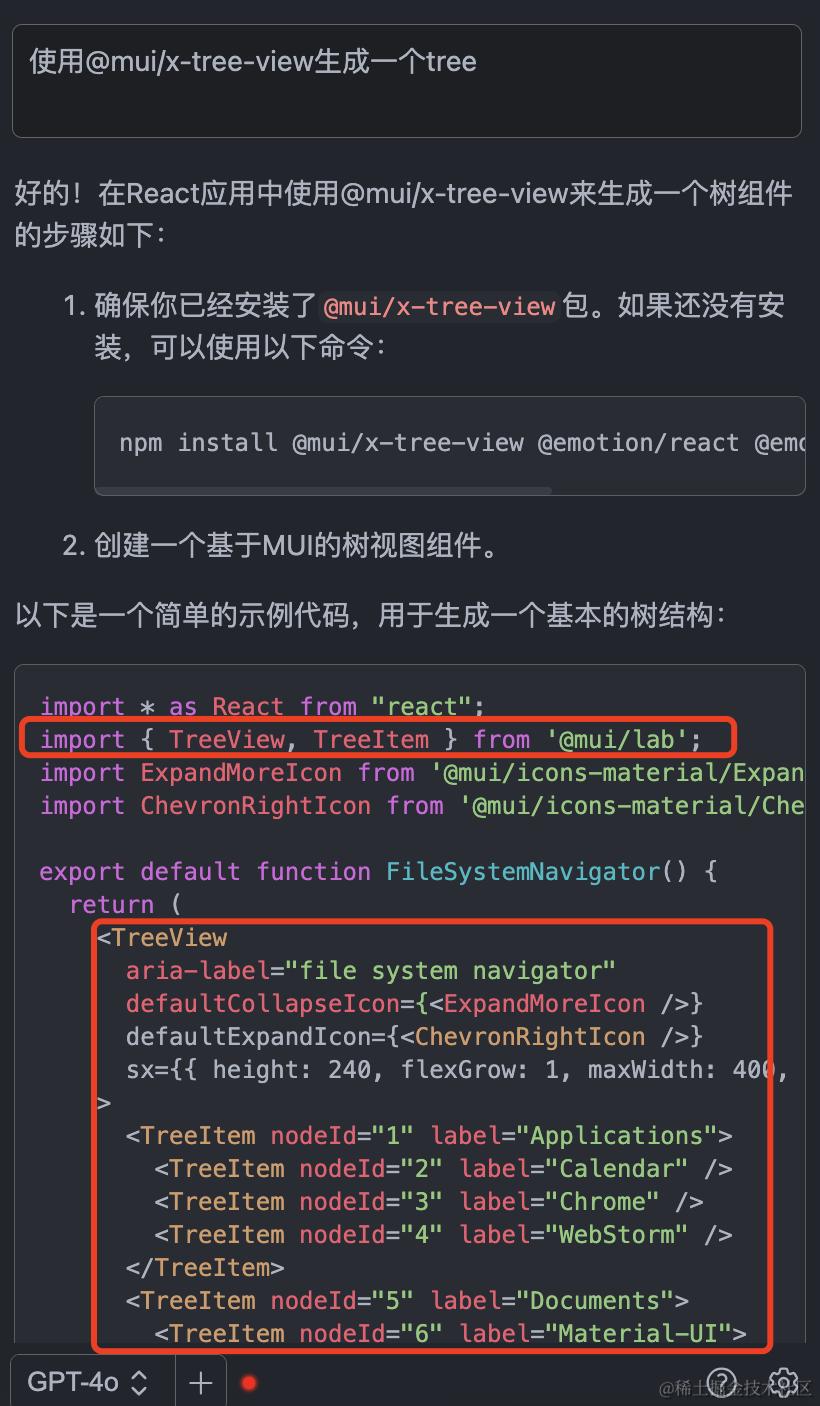 如下,现有的 LLM 不包含最新的@mui/x-tree-view 知识,所以生成的代码是错误的。