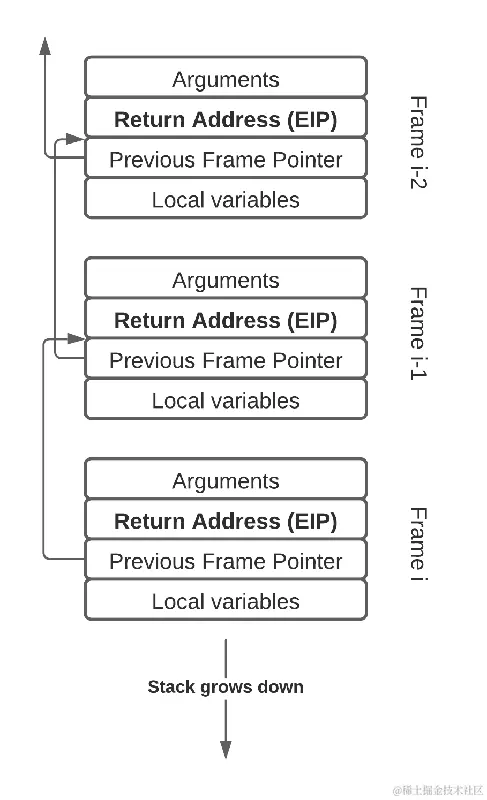 从概念上讲,“挂接到内核进程”的想法听起来很简单。然而,对于可观测性系统来说,实际应用需要相当大的技术复杂性。完整的堆栈跟踪不会仅仅存在于一个整洁的小盒子中等待被收集。在 Pixie 中,通过查看 CPU 上应用程序的指令指针来恢复堆栈跟踪,然后检查堆栈以找到所有父函数(帧)的指令指针。遍历堆栈以重建堆栈跟踪有一些复杂性,但基本情况如下所示。从叶帧开始,并使用帧指针连续找到下一个父帧。每个堆栈帧都包含一个返回地址指令指针,该指针被记录下来以构建整个堆栈跟踪。