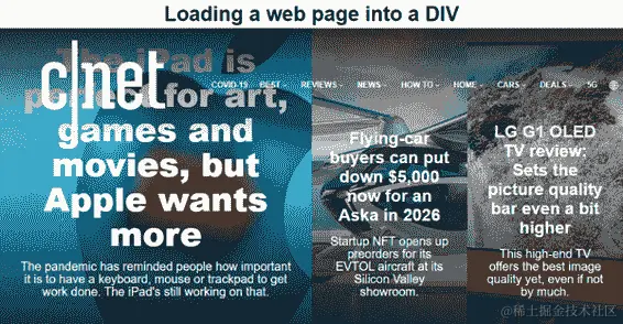当你输入完程序后,可以在浏览器中调用urlpost.html,几秒钟后,你应该会看到news.com首页的内容加载到我们为此目的创建的<div>中。