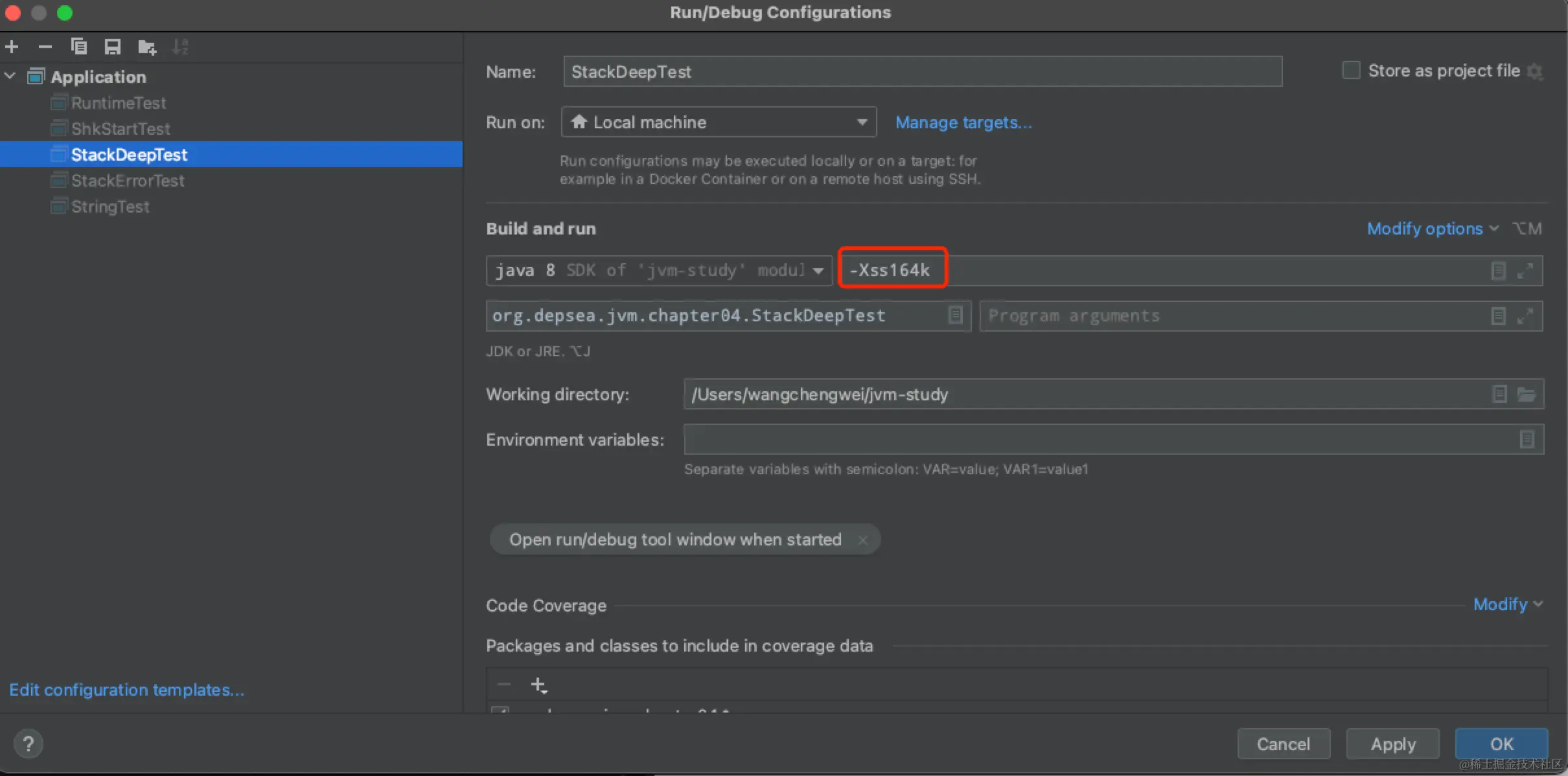 IDEA 设置方法:Run-EditConfigurations-VM options 填入指定栈的大小 -Xss256k