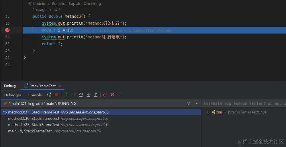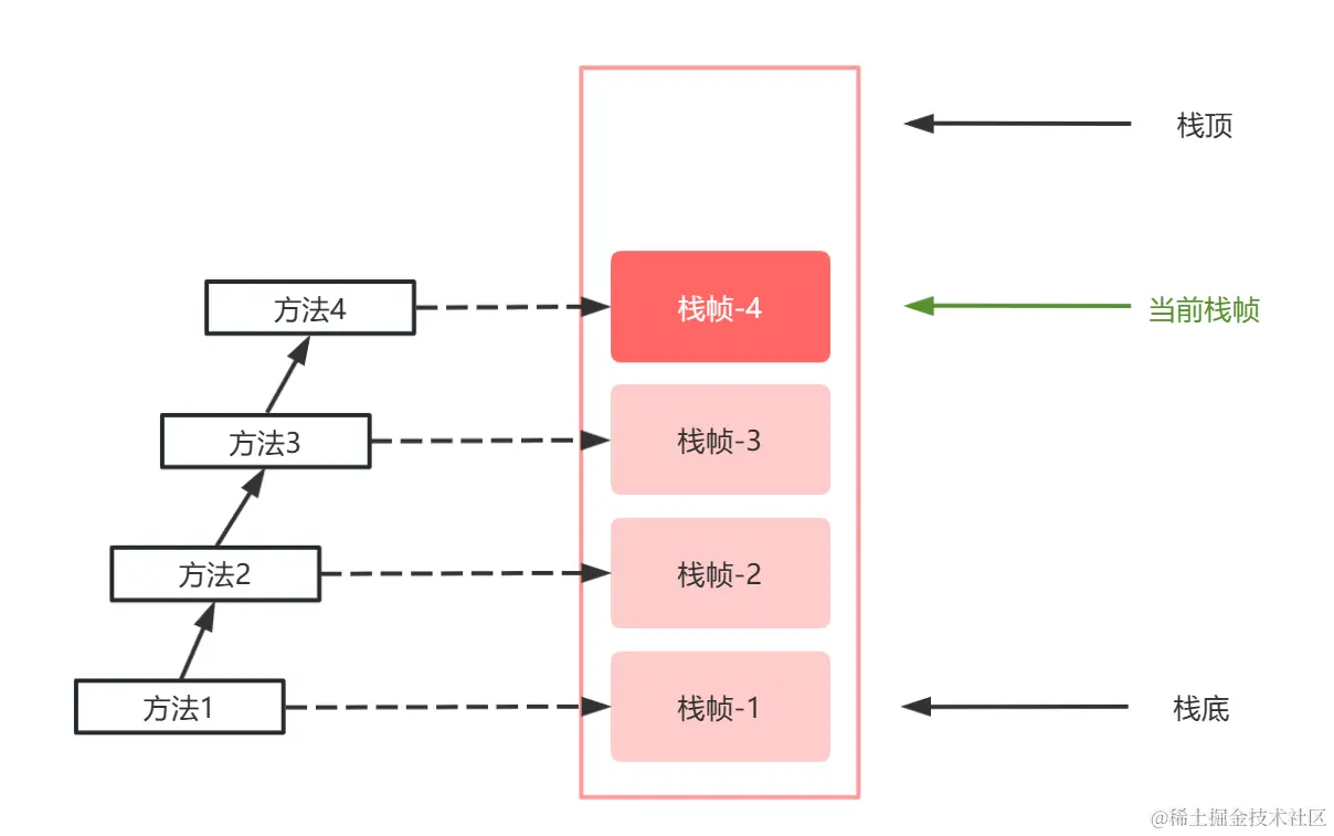 - 如果在该方法中调用了其他方法,对应的新的栈帧会被创建出来,放在栈的顶端,成为新的当前栈帧。