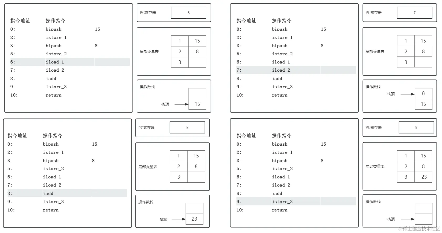 无论通过哪种方式退出,在方法退出后都返回到该方法被调用的位置。方法正常退出时,调用者的pc计数器的值作为返回地址,即调用该方法的指令的下一条指令的地址。而通过异常退出的,返回地址是要通过异常表来确定,栈帧中一般不会保存这部分信息。