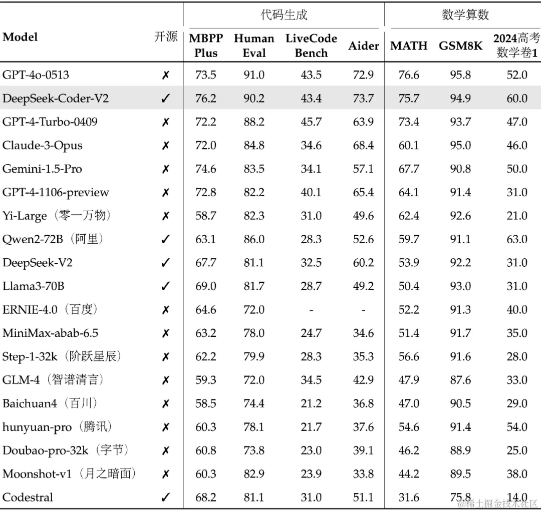 - 数学推理能力: DeepSeek-Coder-V2 在 GSM8K、MATH、AIME 2024 和 Math Odyssey 等数学推理测试中,表现突出,与 GPT-4o、Gemini 1.5 Pro 和 Claude 3 Opus 等闭源模型的成绩相当。例如,DeepSeek-Coder-V2 在 MATH 上取得了 75.7% 的准确率,在 AIME 2024 上的成绩超过了其他模型。