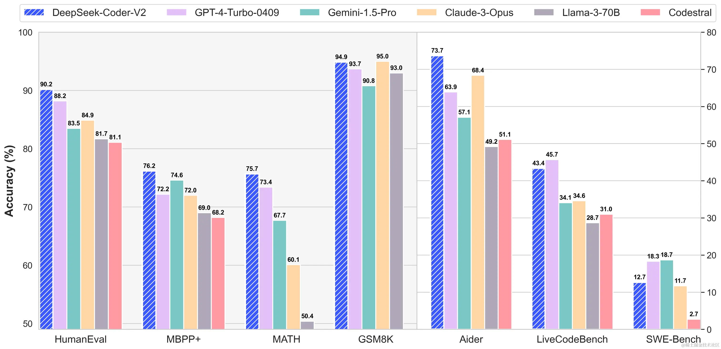 - 代码生成能力: DeepSeek-Coder-V2 在 HumanEval、MBPP、LiveCodeBench 和 SWE-Bench 等代码生成和理解评测中,取得了与 GPT-4-Turbo 相媲美的成绩。例如,DeepSeek-Coder-V2 在 HumanEval 上取得了 90.2% 的准确率,在 MBPP 上取得了 76.2% 的准确率,并首次在 SWE-Bench Lite 上取得了超过 10% 的准确率。