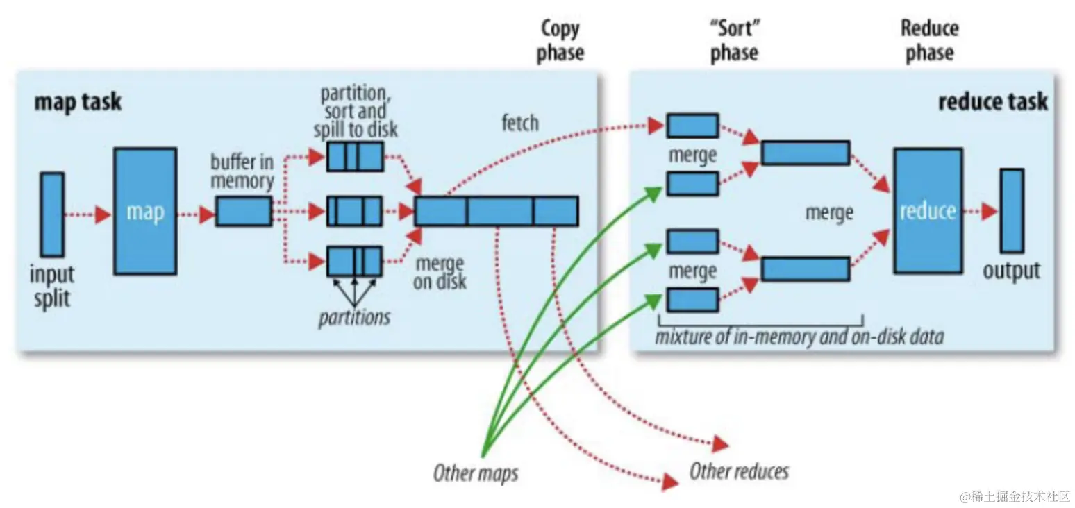 - 当运行 MapReduce 作业时,map 阶段启动,并对每一个输入块执行映射操作(map tasks),生成键值对(key-value pairs)作为中间结果。