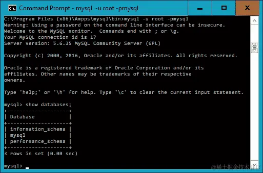 第一条命令切换到 MySQL 目录,第二条告诉 MySQL 使用用户root和密码mysql登录。您现在已登录到 MySQL,可以开始输入命令了。