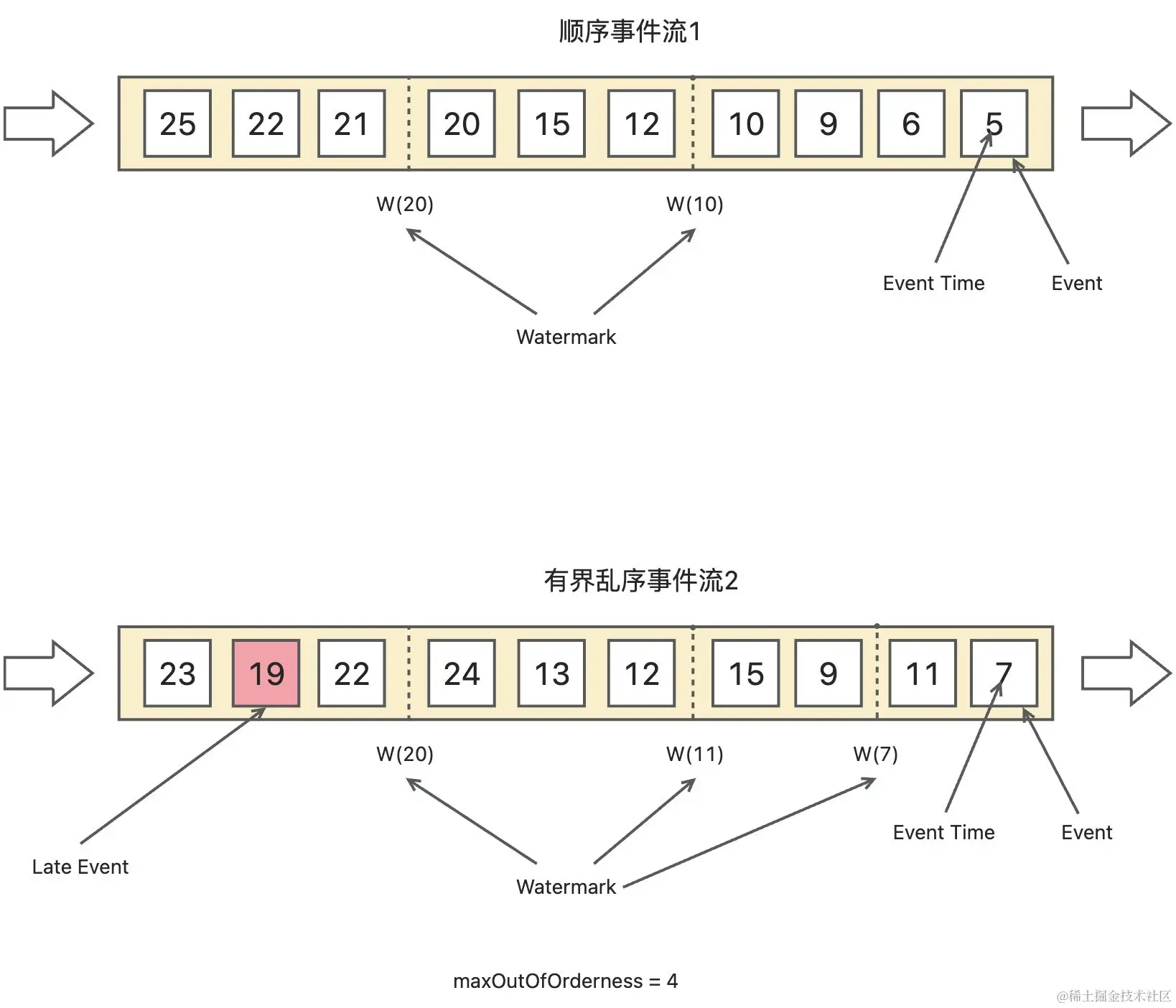 对于 顺序事件流1 比较好理解,W(10) 表示 10 之前的数据都已经到达。