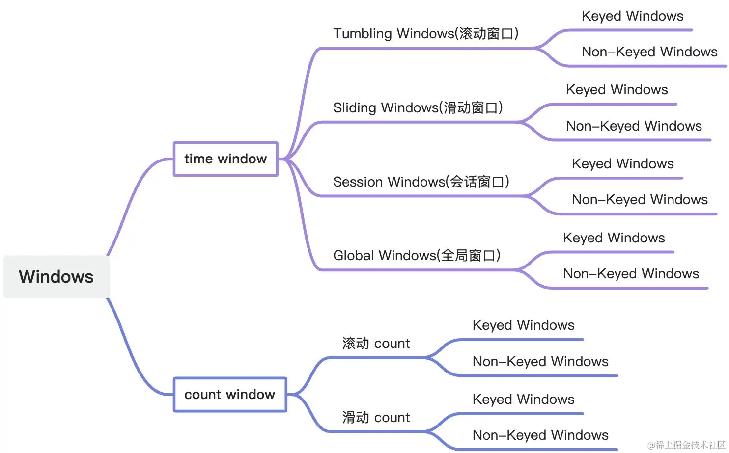 Flink Window 分为 Keyed Windows 和 Non-Keyed Windows,Keyed Windows 是对 KeyedStream 使用窗口操作后产生的,KeyedStream 是我们使用 keyBy 算子,对 Stream 按 key 分区后产生的。