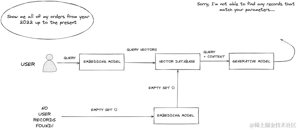 在以下 RAG 工作流中,用户的自然语言查询首先转换为查询向量,然后发送到向量数据库以检索与用户参数匹配的订单。