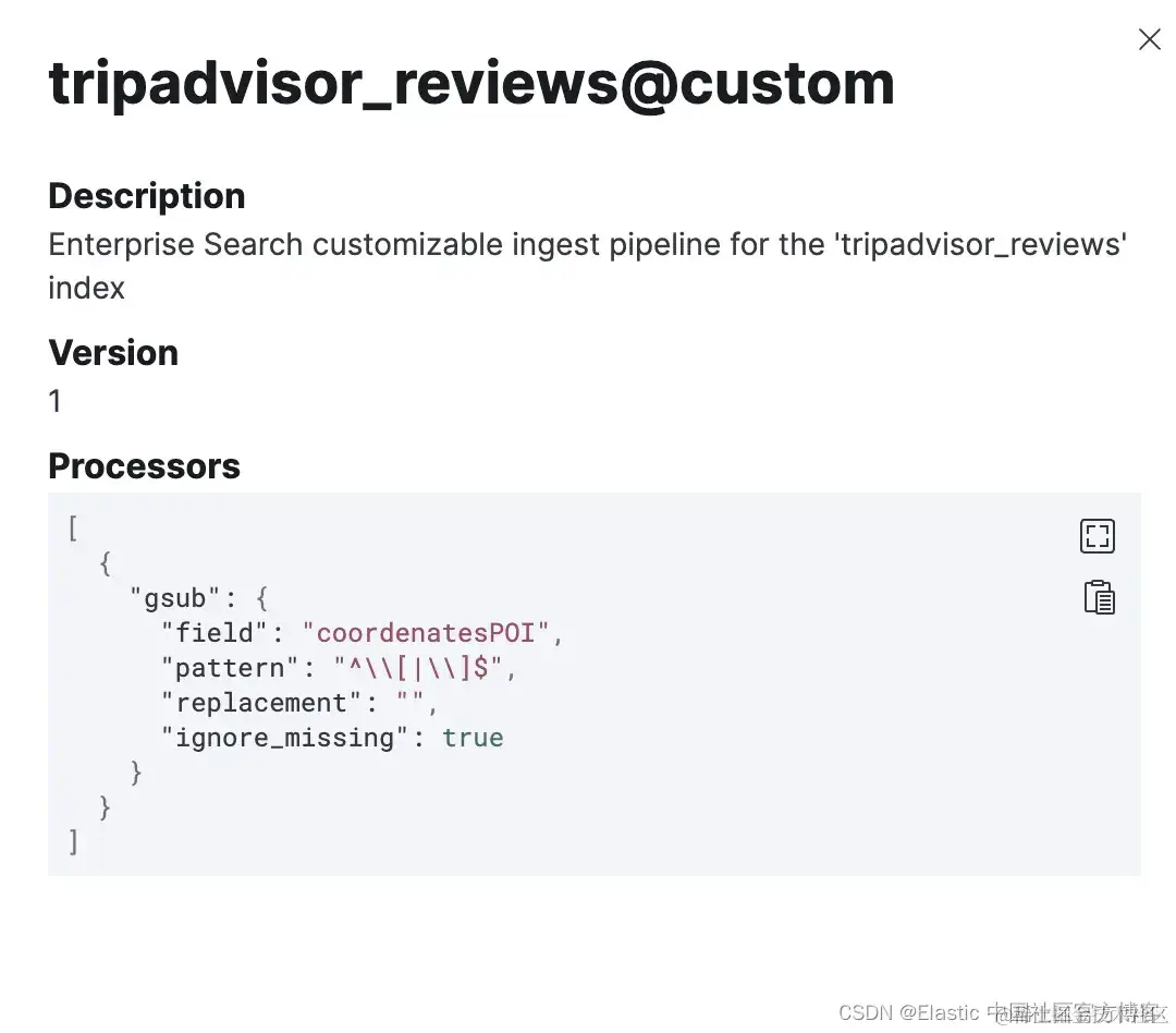 2)在此数据集中,我们需要调整 “CoordinatesPOI” 字段,使其适合 geopoint 映射格式。为了实现这一点,我们使用带有 gsub 处理器的自定义提取管道。它将坐标字段从字符串数组格式(如 “[1,2]”)更改为字符串格式(如 “1,2”)。