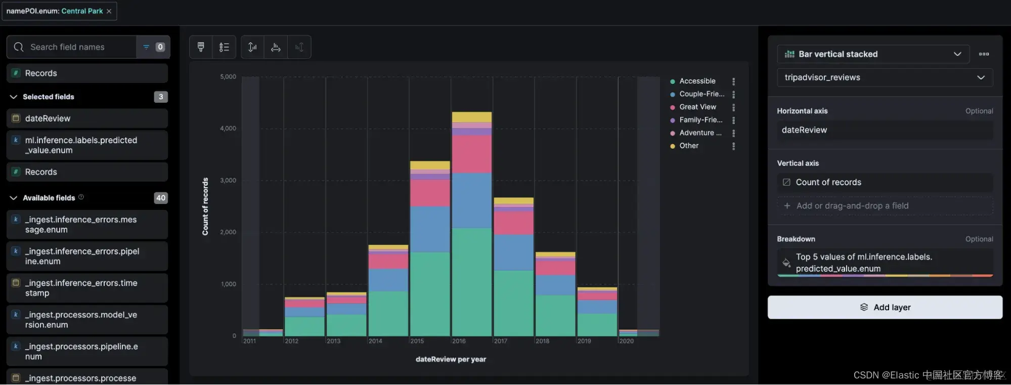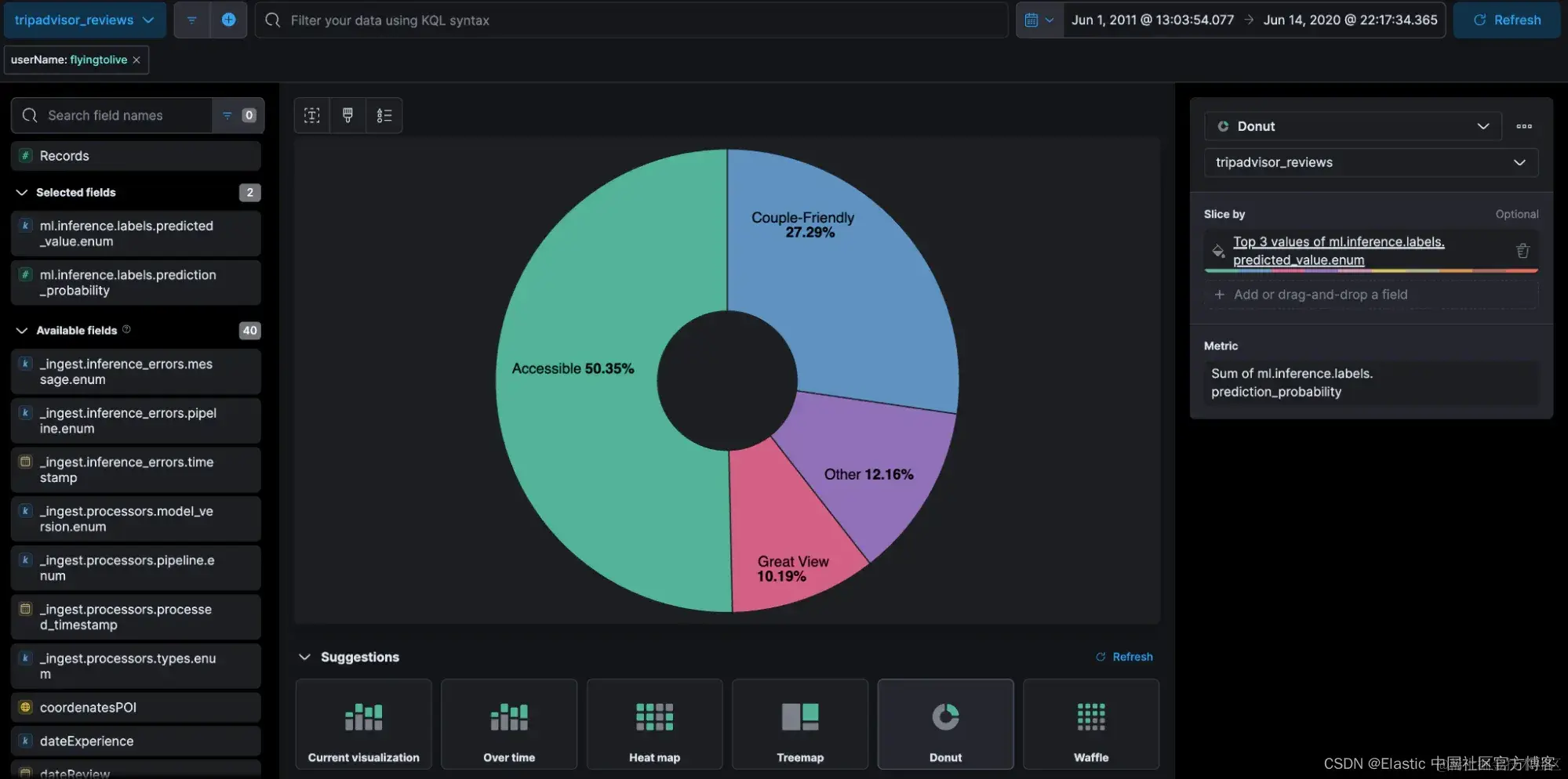 由于 Elastic 与 Kibana 捆绑在一起,可以用于聚合和语义搜索,因此可以通过多种方式分析数据并通过 Kibana Lens 生成报告。在评论数据场景中,这些信息可以与希望了解其业务趋势分析的企业共享。
