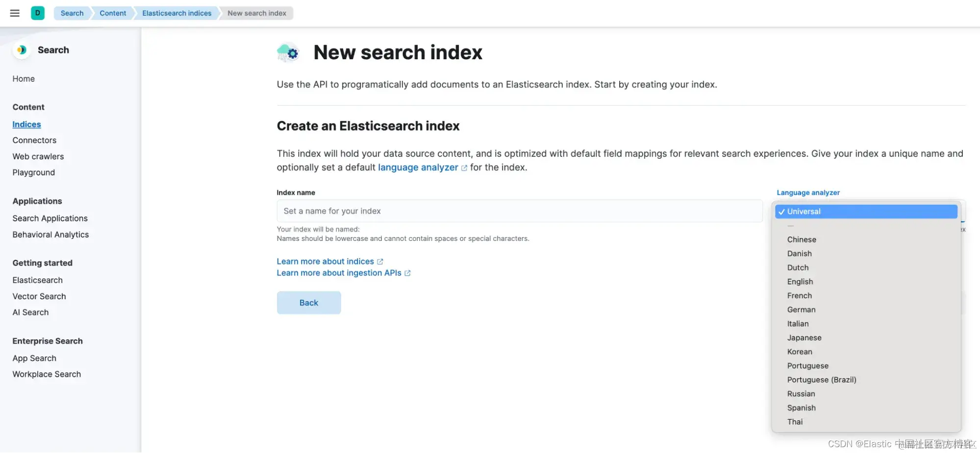 在 Kibana 中,在 “Search” > “Indices” 下创建搜索索引。