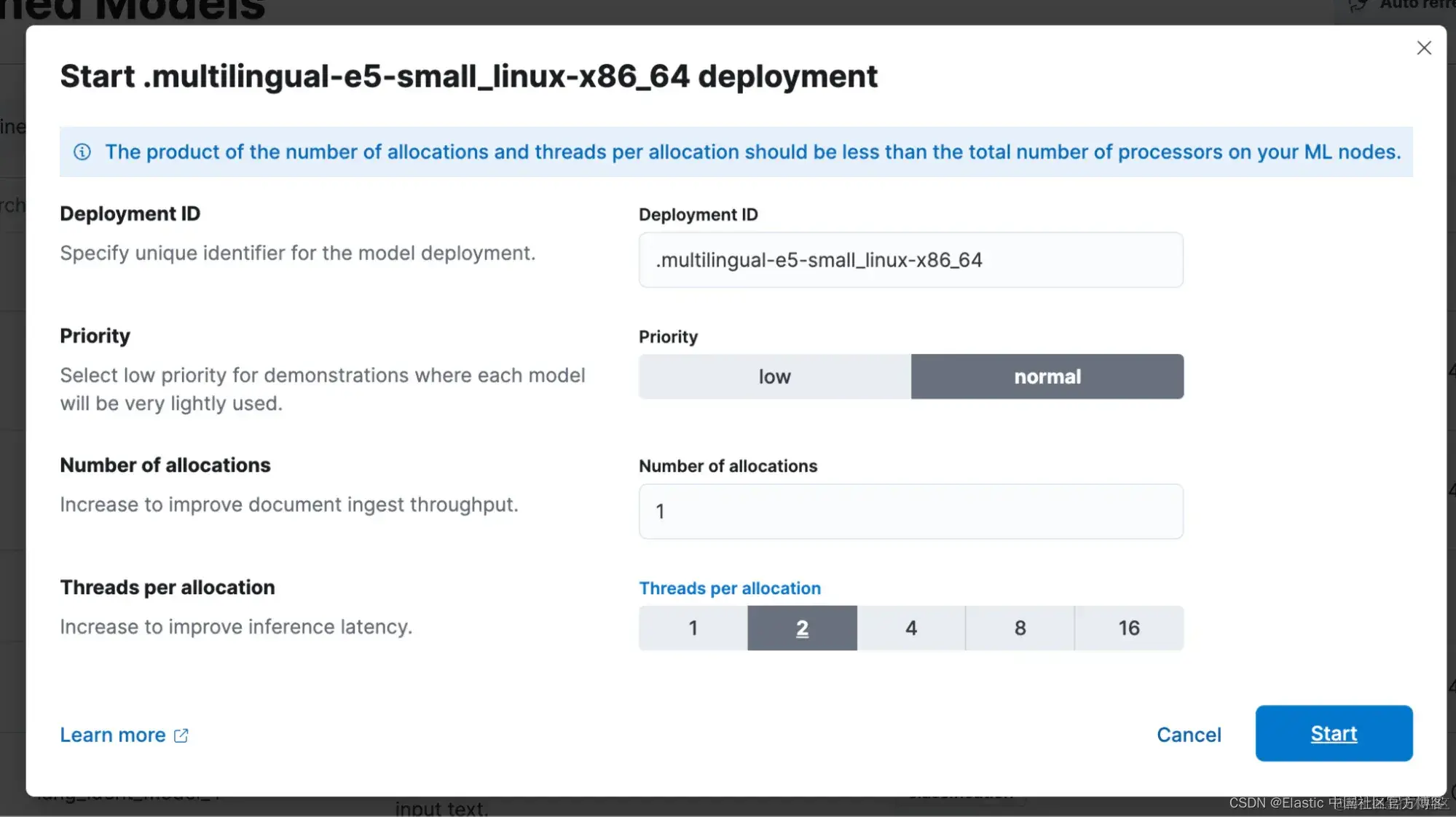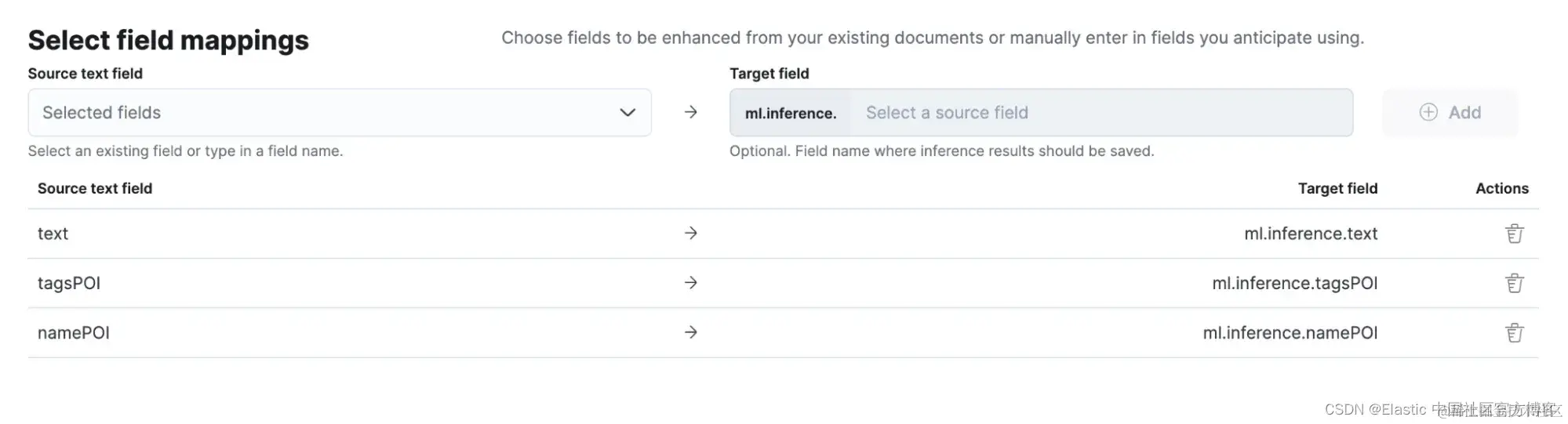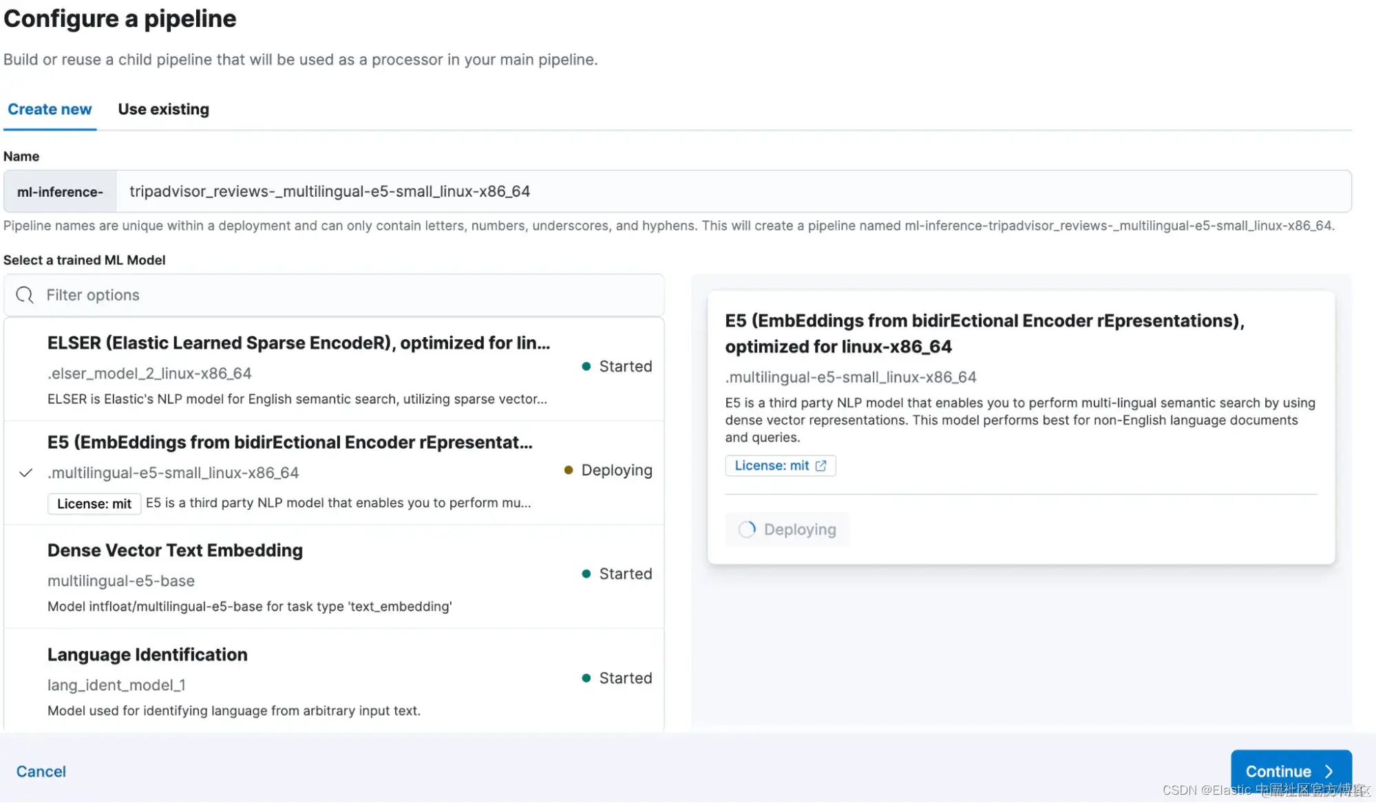 1)要将 e5 模型与采集管道集成,请导航到新创建的索引中的 “Pipelines”,部署并启动机器学习 (ML) 推理管道。本例中用于推理的文本字段为 “text”、“tagsPOI” 和 “namePOI”。
