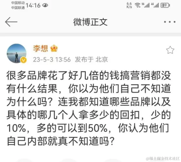 这也逼得理想创始人李想亲自回应,称理想的市场费用率只有0.6%,但却爆料不少车企拿回扣多达50%。虽然李想很快删掉了帖子,但不少网友均认为出身于汽车之家的李想说的都是实话。