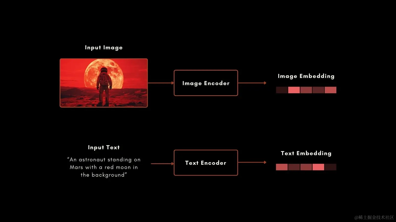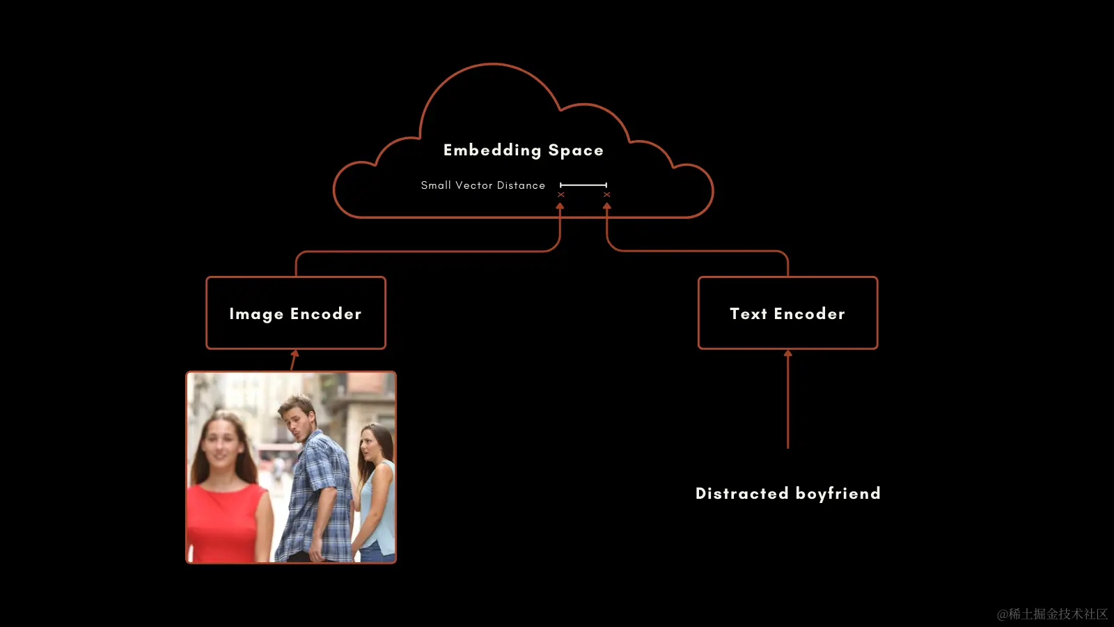 在 2021 年 1 月,OpenAI 推出了开创性的 CLIP 模型,其架构简洁却极具巧思:将一个文本编码器与一个图像编码器结合,在统一的向量空间中输出结果。CLIP 的文本向量与图像向量之间的距离,反映了两者语义关联的紧密程度。