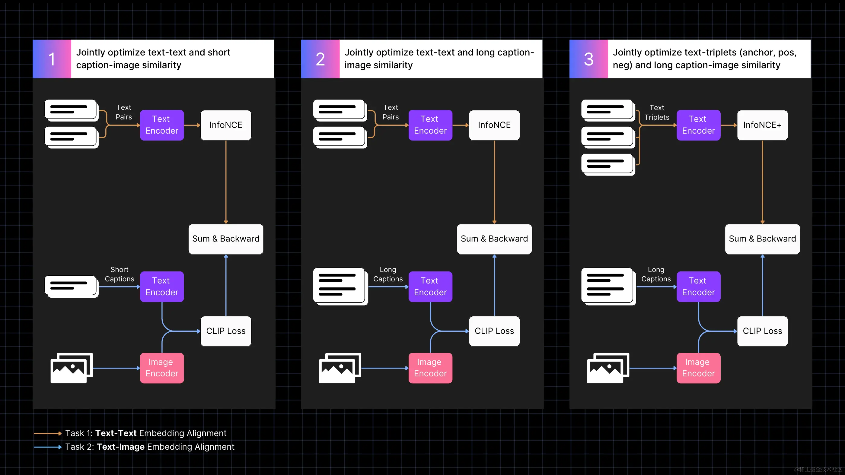 因此,我们有针对性地设计了训练方案来改善这一问题,通过两个任务共同优化、以及长文本单项优化的方式进行训练,具体分为三个步骤: