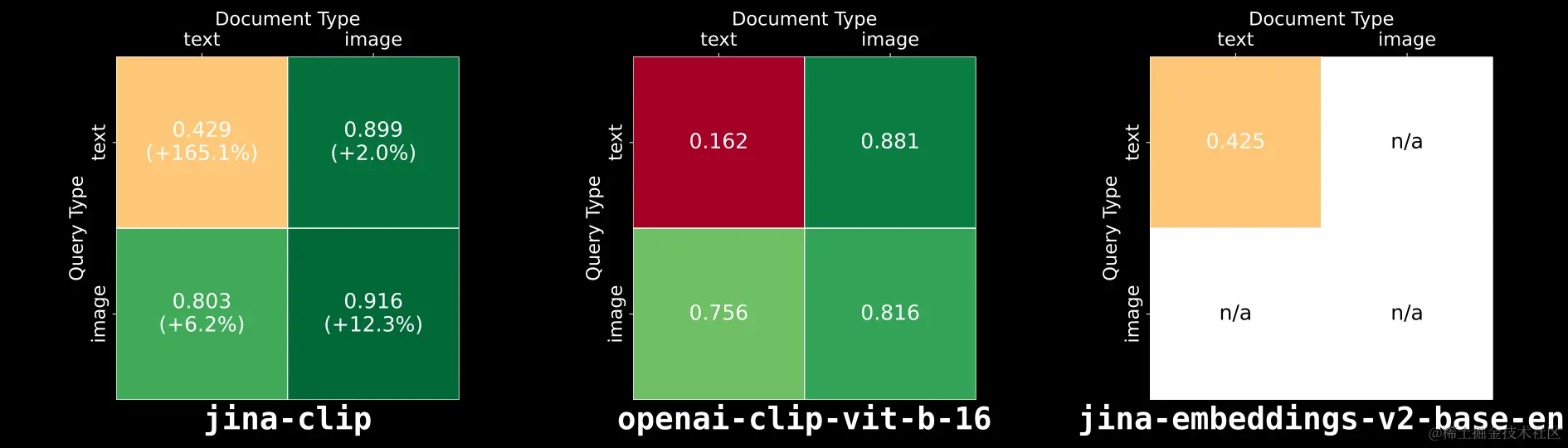 结果如上图所示:,jina-clip-v1 在所有类别中均优于 OpenAI 的原始 CLIP,尤其是在纯文本和纯图像检索方面,表现显著优越。平均来看性能提升了 46%。