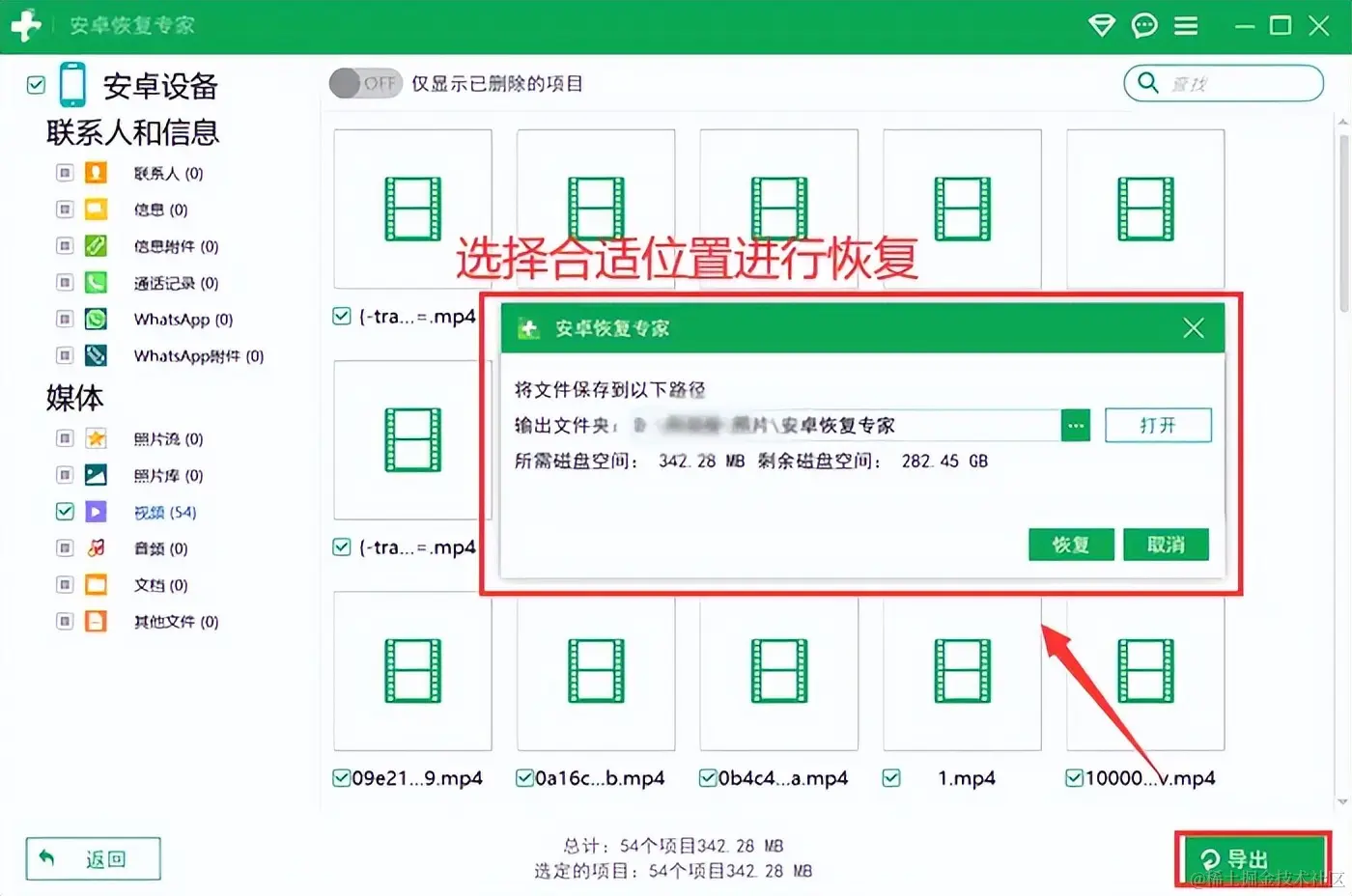 第三步:它将对您的手机进行深度扫描,查找已删除的数据,扫描完成后,您将看到一个详细的文件列表,其中包括已删除和现有的文件。选择选择需要恢复的视频,将它们导出到指定位置即可。