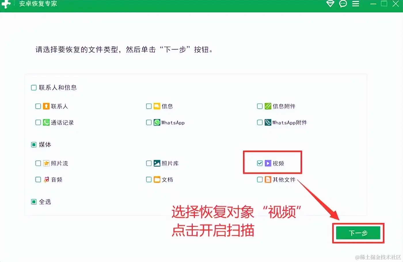 第二步:接下来,选择要恢复的数据类型。选中 【视频】 ,并点击 【下一步】 ,就能够开启扫描程序。