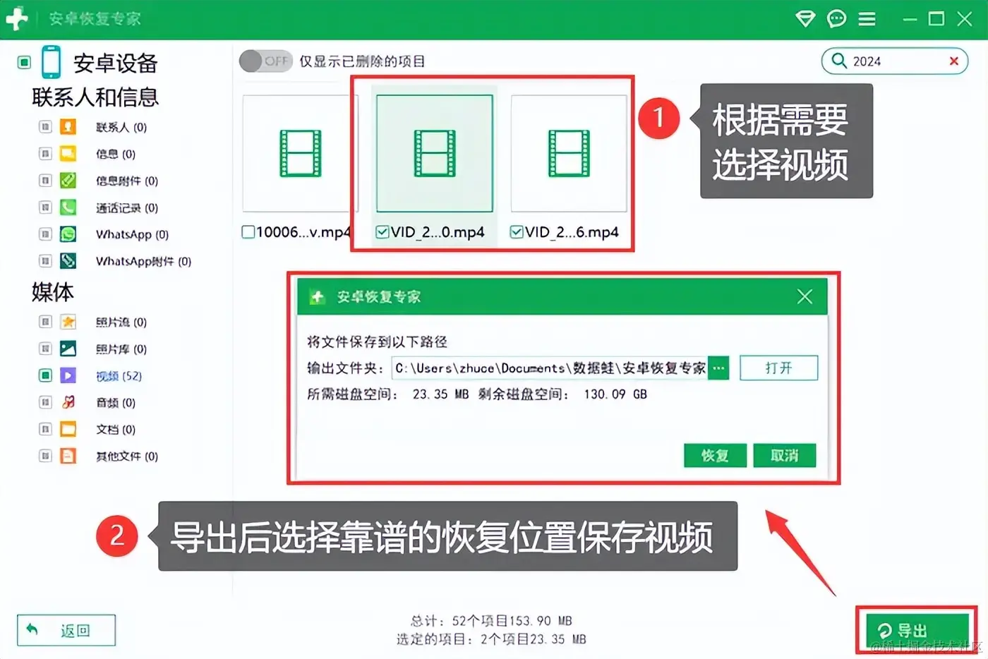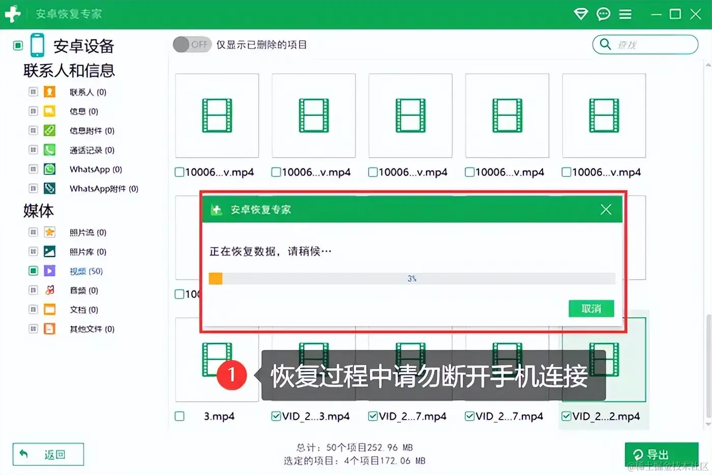 第二步:选择数据类型后,它将自动开始扫描您的手机。扫描完成后,您可以看到手机中所有可恢复的视频列表,找到需要恢复的数据后,将它们选中,并确定保存位置。