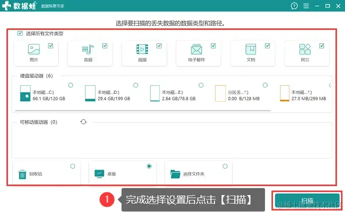 步骤1:下载软件到电脑上,进入主界面,根据个人需求,完成扫描设置(选择文件类型和磁盘),点击【扫描】;