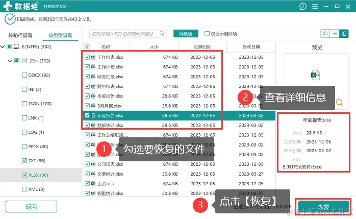 步骤3:将需要恢复的文件勾选好后,点击【恢复】,并选择文件恢复后的保存位置,等待恢复完成。
