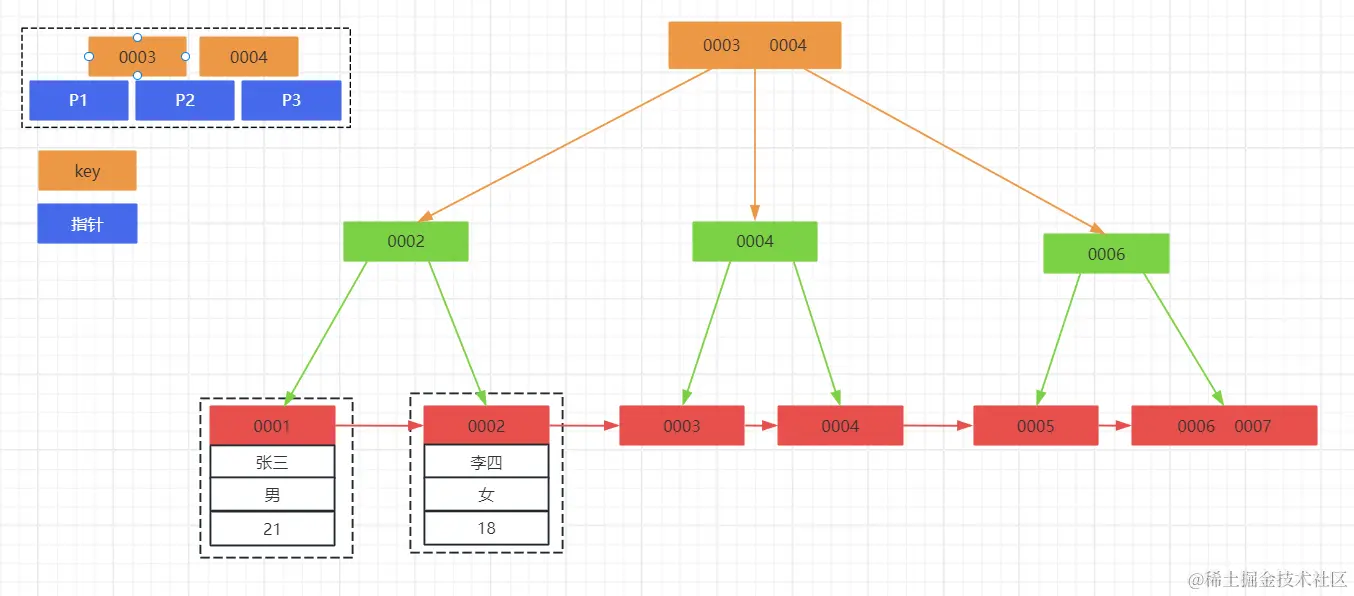 - 子节点指针(Child Pointers):指针指向节点的子节点。在B+树中,每个非叶子节点的子节点指针数量总是比关键字的数量多一个。