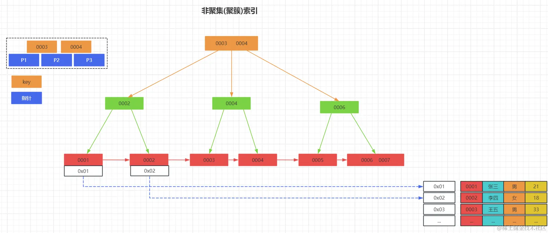 在MySQL中,非聚簇索引就是这样的“新华字典”,它的叶子节点存储的是索引列的值和对应数据行的指针,而不是数据行本身。