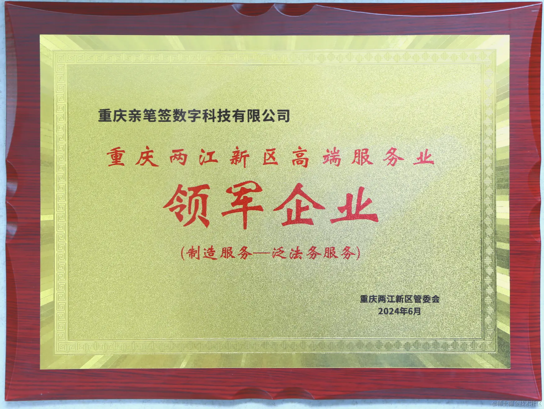 近日,重庆两江新区举行服务业高质量发展大会,会议发布了《重庆两江新区加快高端服务业发展行动计划(2024-2027年)》、两江新区服务业投资机会清单,并向高端服务业领军企业和示范园区进行授牌。亲笔签数字科技获评重庆两江新区高端服务业“领军企业”。
