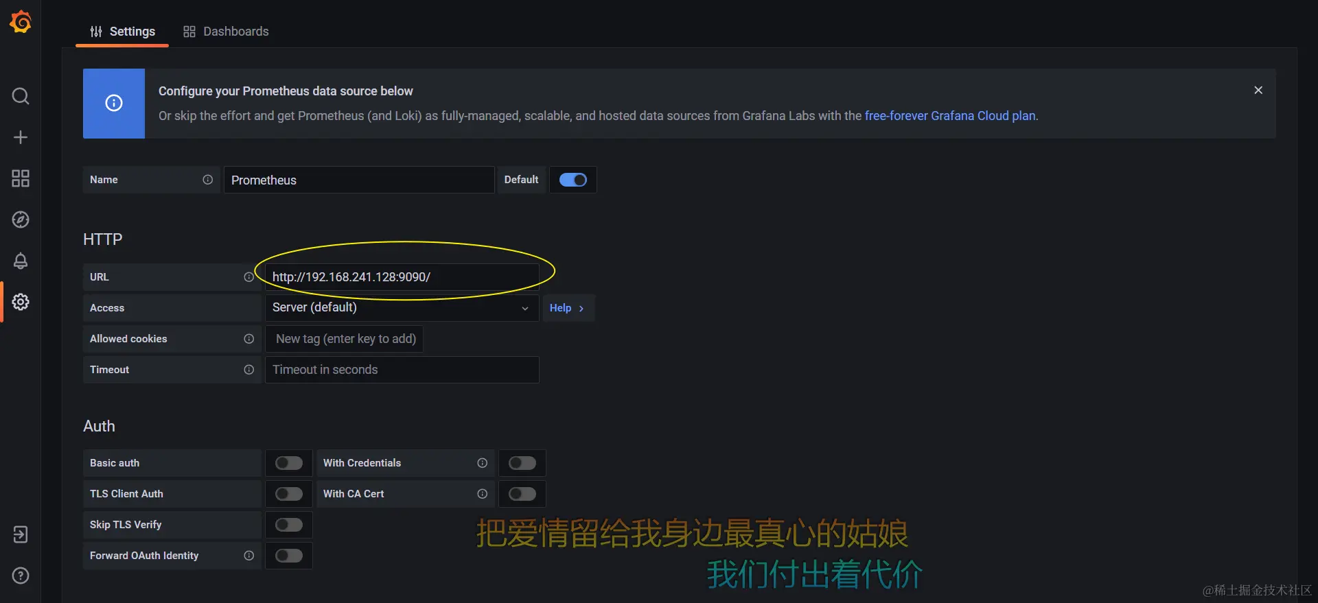 这里只需要配置prometheus地址,如果设置了密码和认证相关的就自己摸索摸索