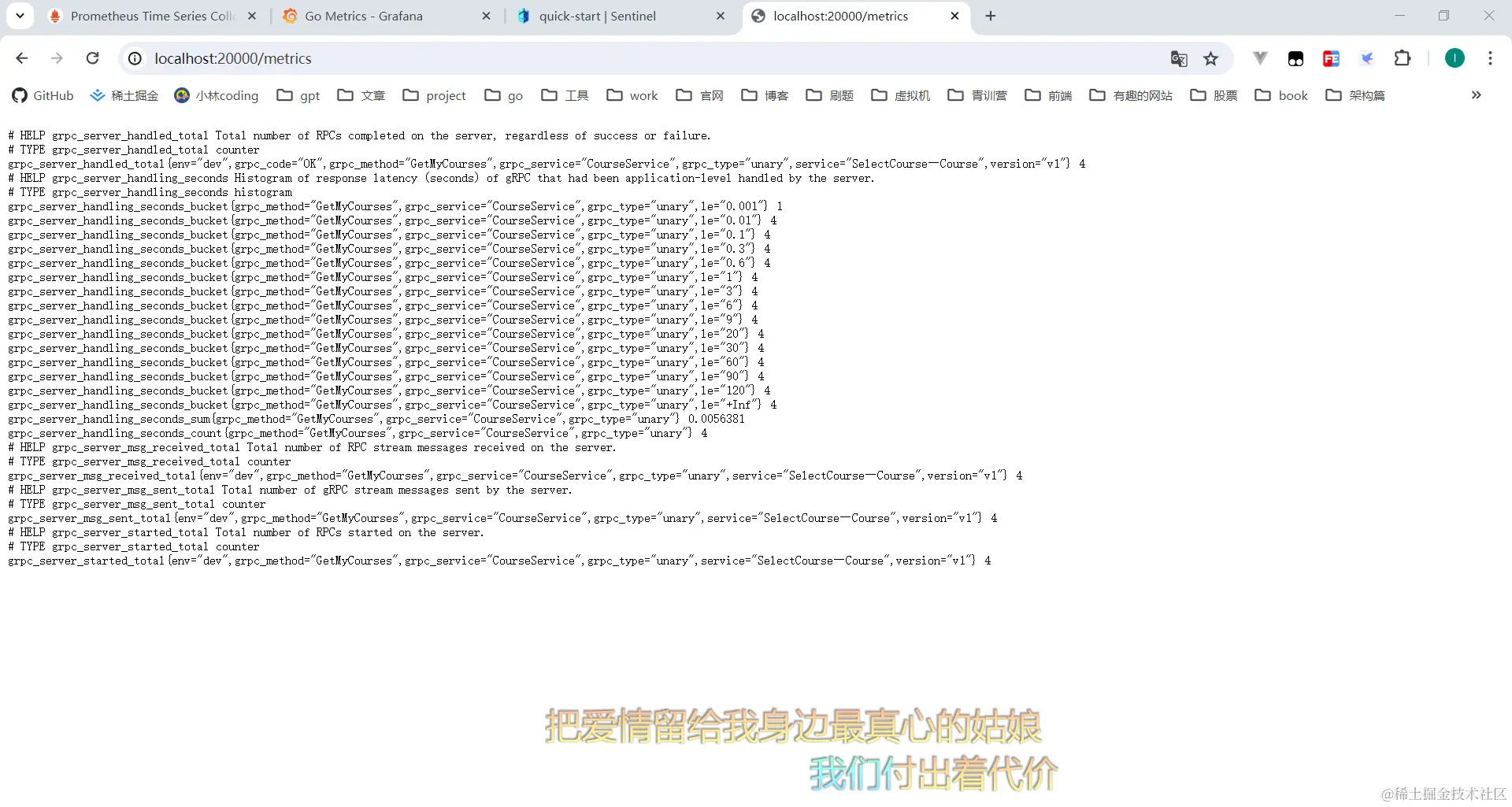 - 利用go-grpc-middleware中间件结合Prometheus客户端库,实现了对gRPC服务(以Course服务为例)的监控,通过暴露/metrics端点收集服务性能指标。